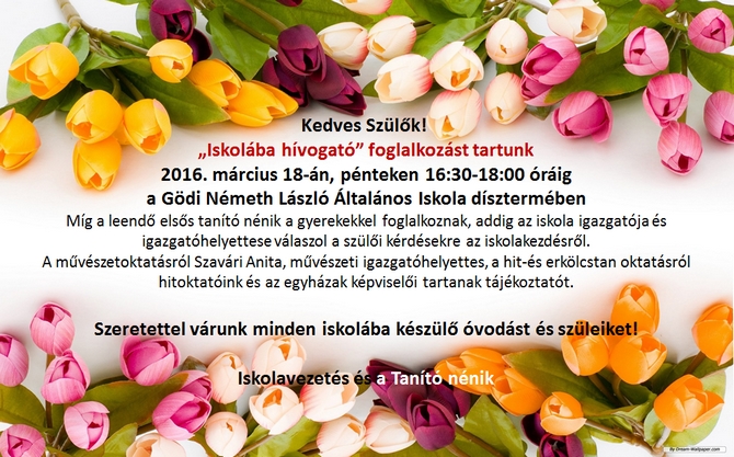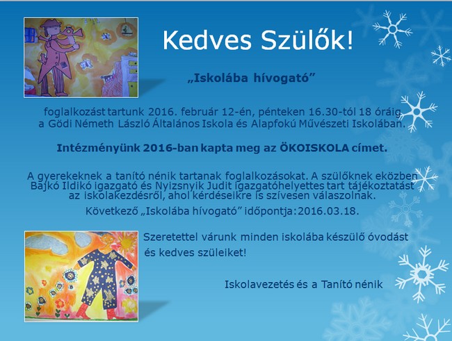 Tájékoztatjuk a kedves Szülőket, hogy a Szülői Munkaközösségünk kérésére, a törvény figyelembevételével és az iskolában folyó magas színvonalú nevelő-oktató munka miatt az alsó tagozaton 16 óráig tartó oktatás folyik.