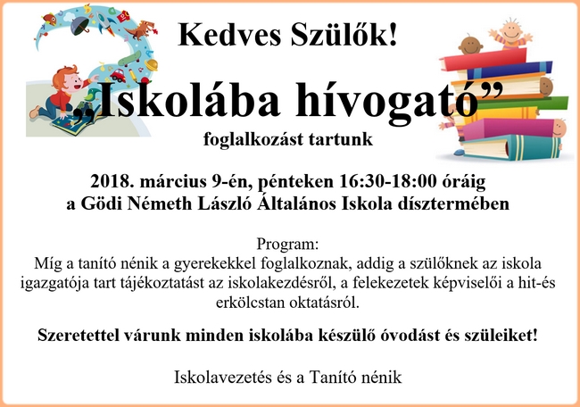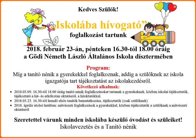 Szeretettel várjuk a 2017/2018. tanévben elsős tanulók szüleit: