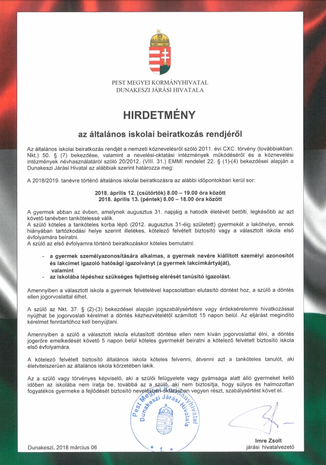 Tájékoztató a beiratkozásról, elsős osztályfőnökök (2018.04.05.)