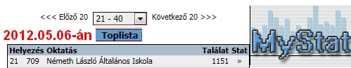 21. helyezést értünk el a honlap látogatóinak számában 2012.05.06-án a MYSTAT oldalon.